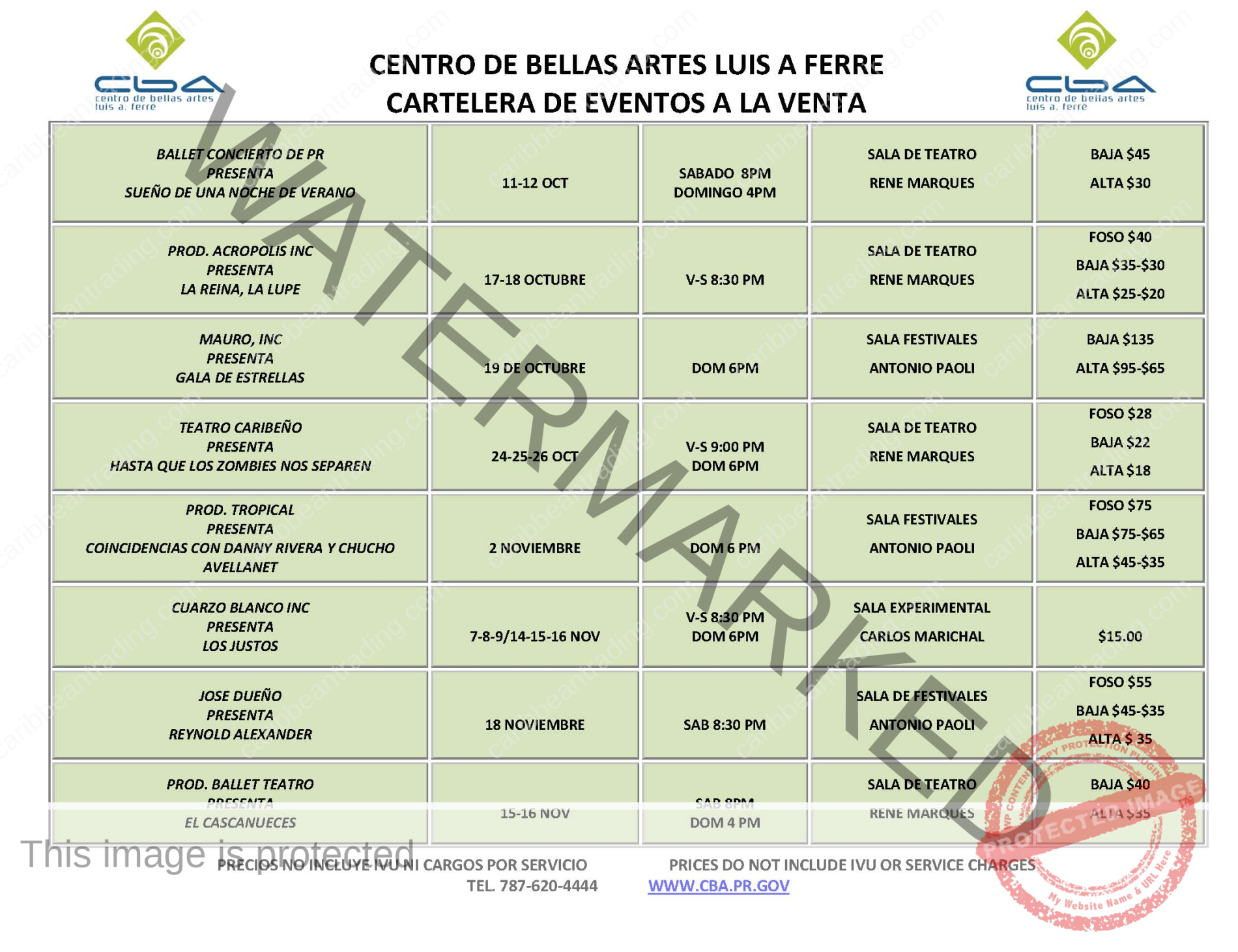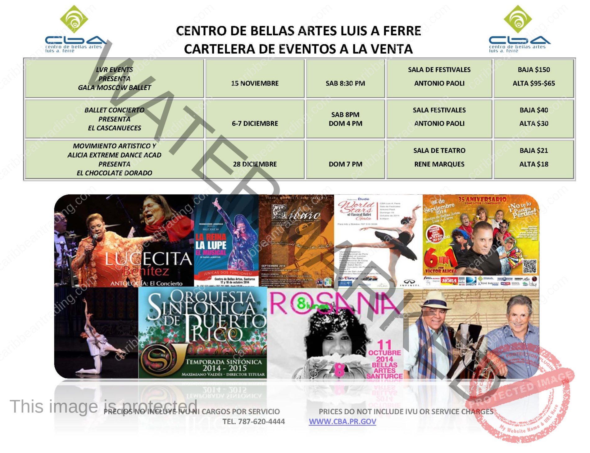 If you are interested in attending a performance at Bellas Artes in San Juan, Puerto Rico, here is the 2014-2015 schedule of events. Located in the Santurce area, Bellas Artes is within walking distance of the Museum of Art, the Contemporary Museum of Art, as well as some really great restaurants; so make a day of it and experience some of the best art and culture Puerto Rico has to offer! The Center features four main concert and theater halls, two eateries and a central outdoor plaza, each with its own unique features and is used for plays, ballet, operas and concerts. The Center is surrounded by various art expositions, including murals, paintings, and sculptures. The Bellas Artes Puerto Rico Center is also home to the Puerto Rico Symphony Orchestra and the annual Casals Festival. Click on the images below to enlarge them and read them better. To visit their website, click Here