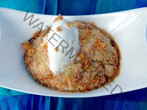 - Combine the two mixtures in a baking container, cover with the cobbler dough and bake for 15-20 minutes at 350. Serve warm topped with coconut ice cream.